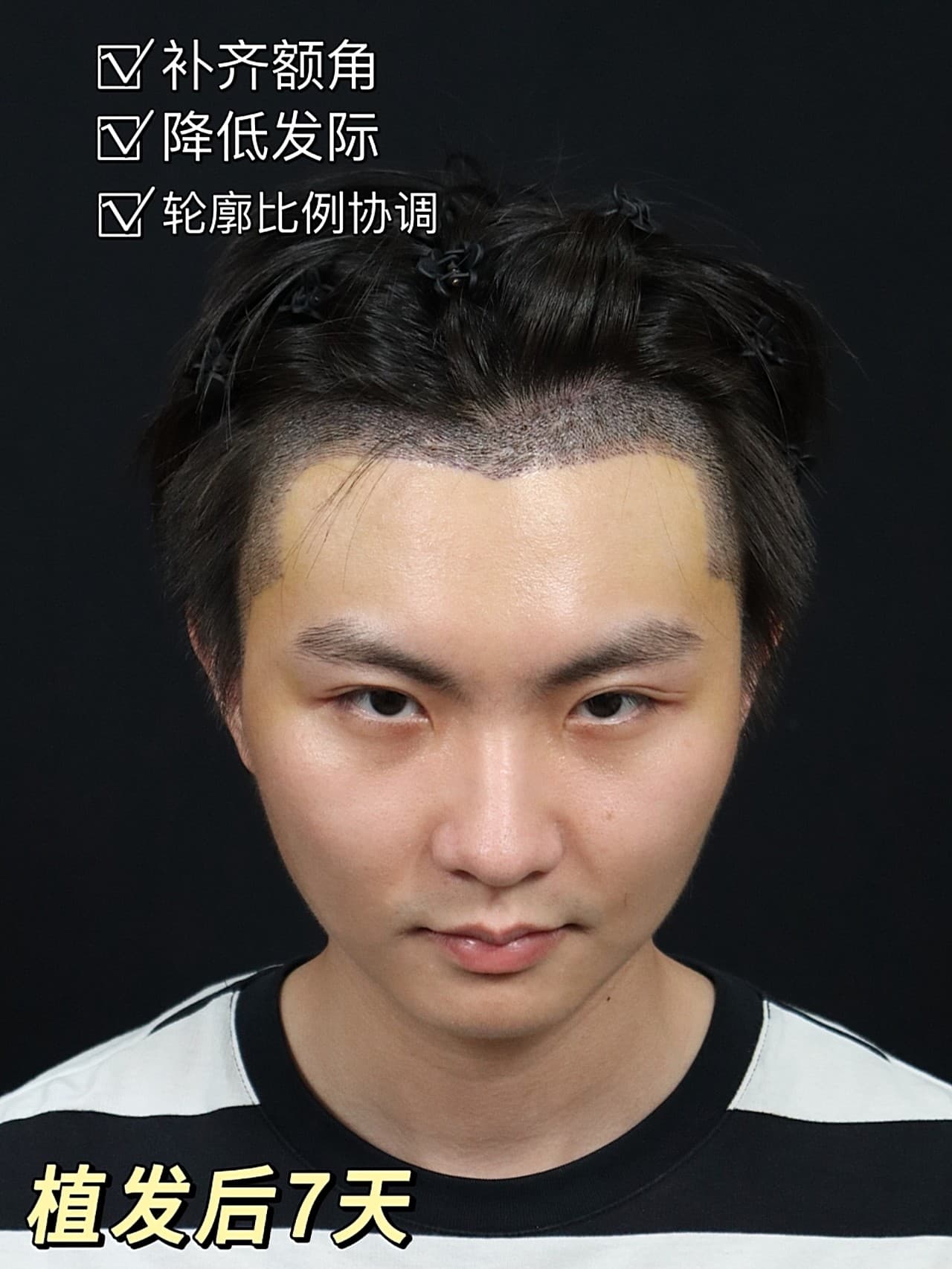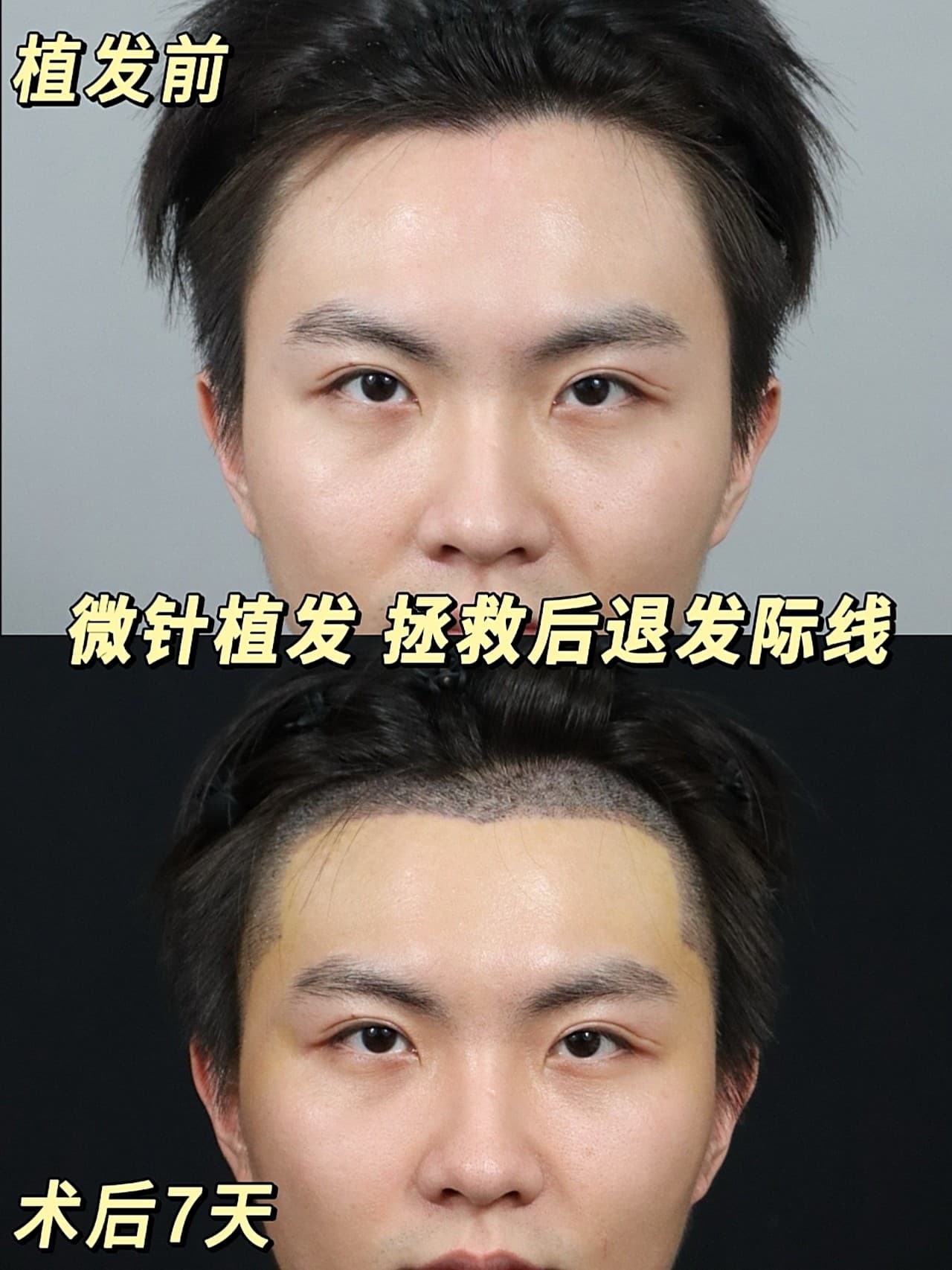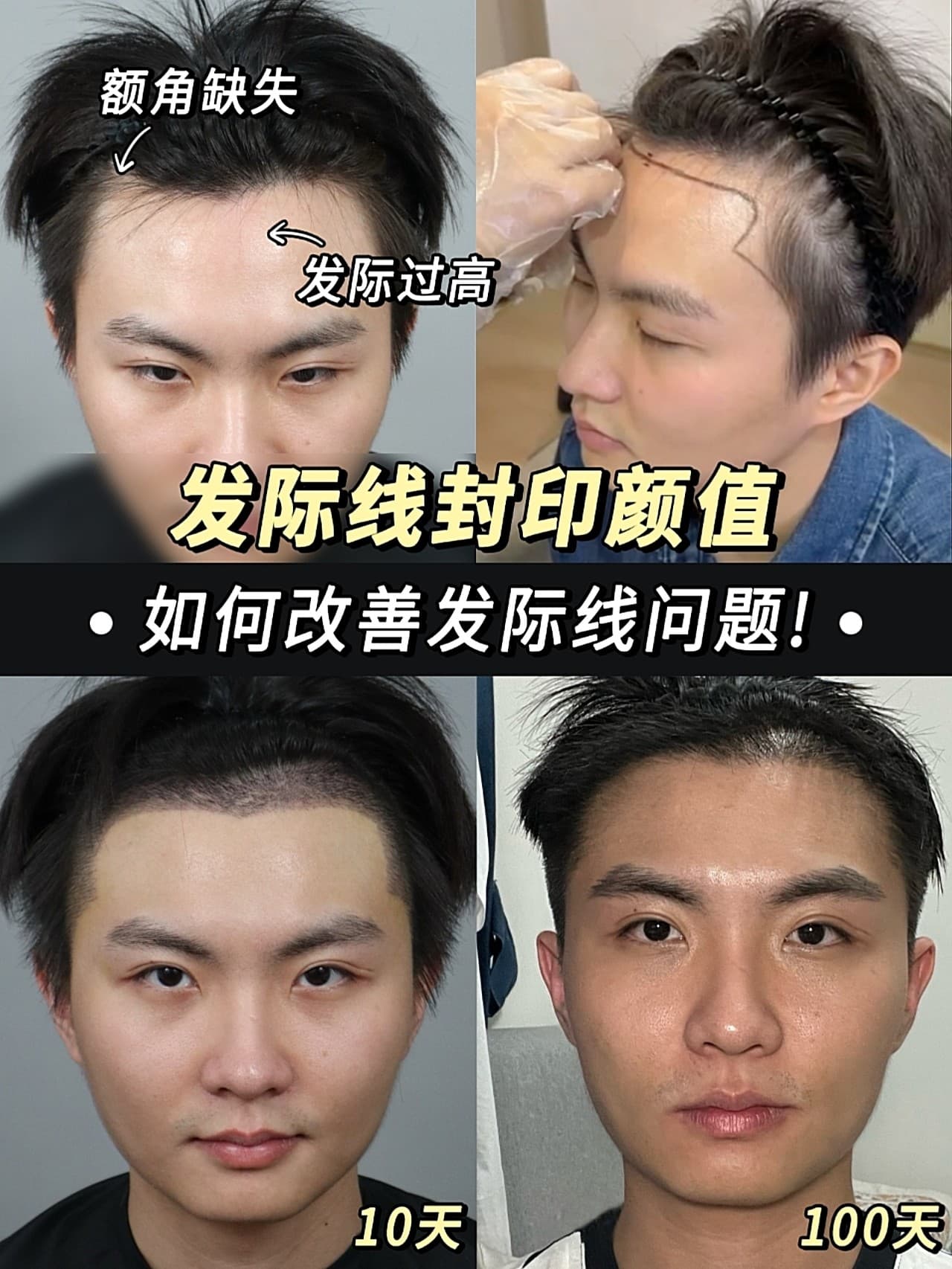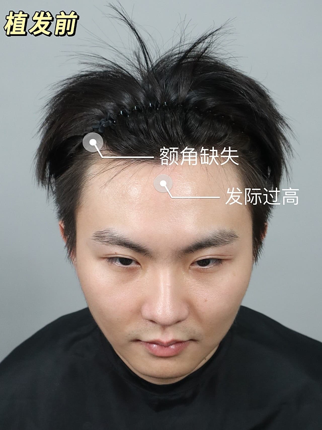 我是属于典型的M型秃,两边额角后移,显得脑门大。还特地去医院做了毛囊检测,医生说后脑勺头发资源还行,可以种。 我选的自然款带了一点美人尖,完全直的发际线会像假发